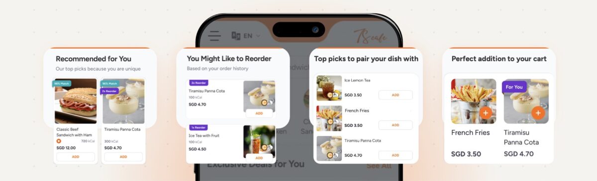 From recommending add-ons during browsing, to suggesting premium options at checkout, each touchpoint leverages real-time data to naturally increase average check size—while giving customers a smooth, personalised ordering experience.